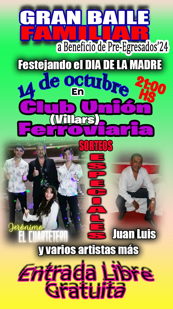 El próximo sábado 14 de octubre en el Club Unión Ferroviaria de Villars se llevará a cabo un gran baile familiar con el objetivo de recaudar fondos para los egresados del año 2024 y que puedan realizar su campera de egresados.