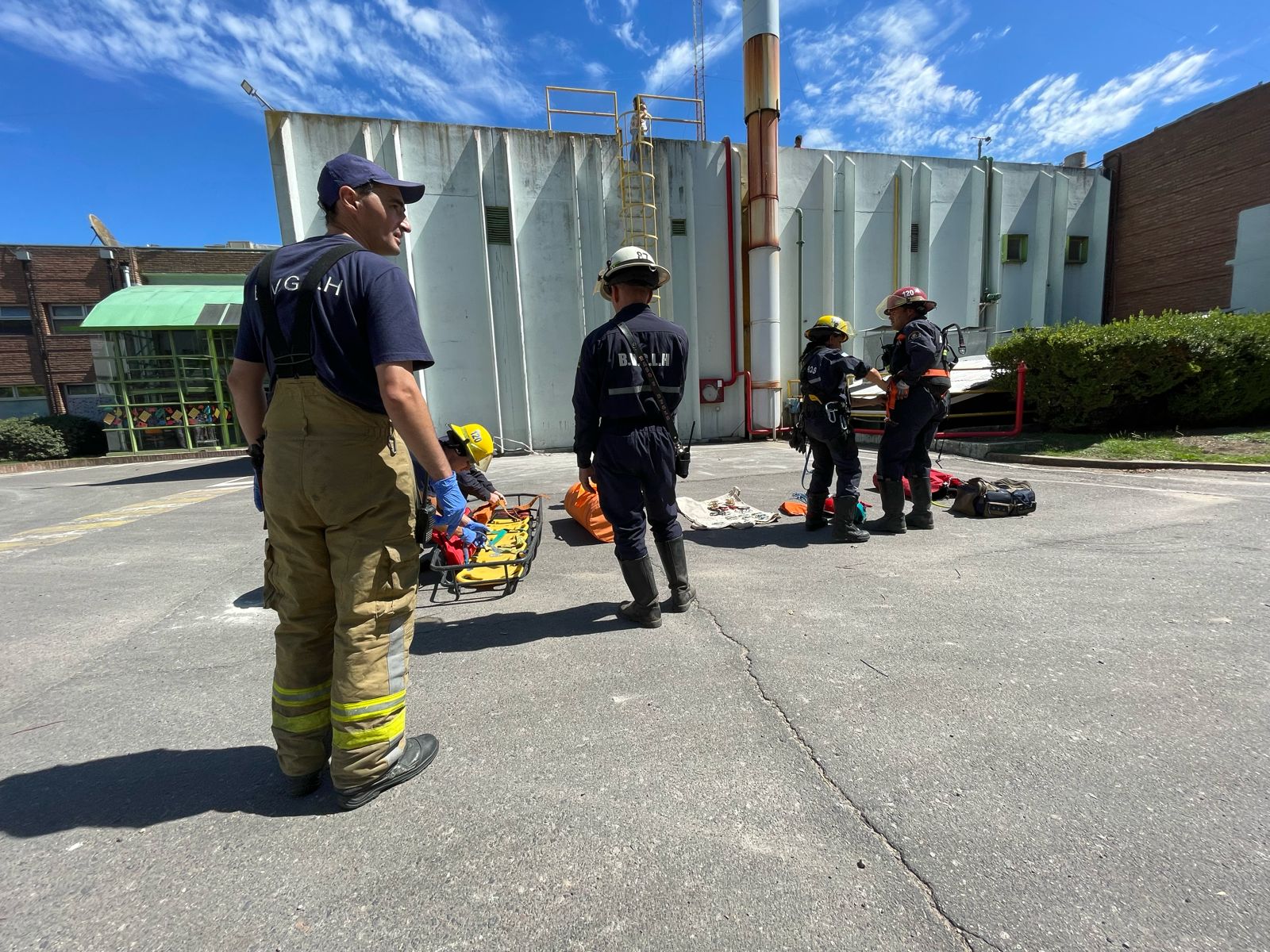 🚒Trabajaron dos dotaciones, entre ellas la Brigada de Rescate en altura de Bomberos Voluntarios. Inmovilizaron al operario y realizaron las maniobras con material específico para un rescate en altura. Además se trabajó con un elevador tijera que aportó la empresa.