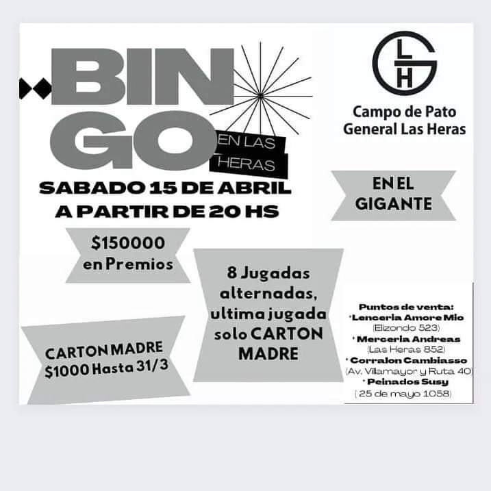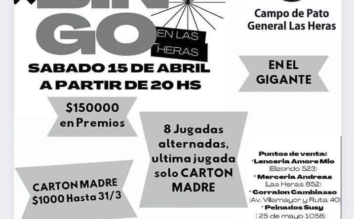 El próximo sábado 15 de abril el campo de pato de generar las Heras realizará un bingo en el gimnasio municipal.